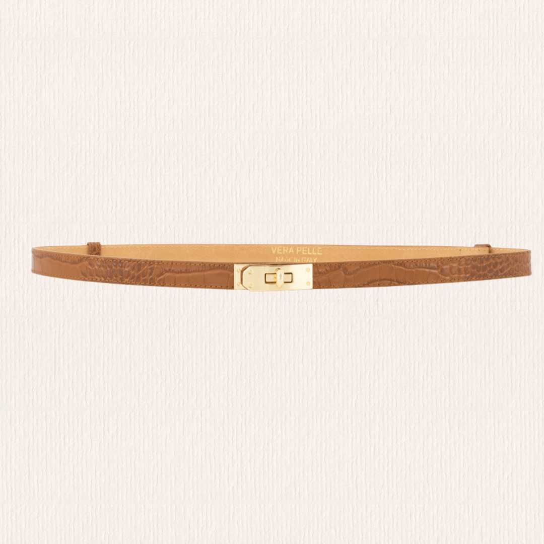 Deze leren wikkelriem is gemaakt van leer met een subtiele croco-print en is afgewerkt met een elegante goudkleurige draaisluiting. Dankzij het verstelbare schuifsysteem kan de riem op elke gewenste maat gedragen worden, waardoor hij zowel comfortabel als veelzijdig is in gebruik.