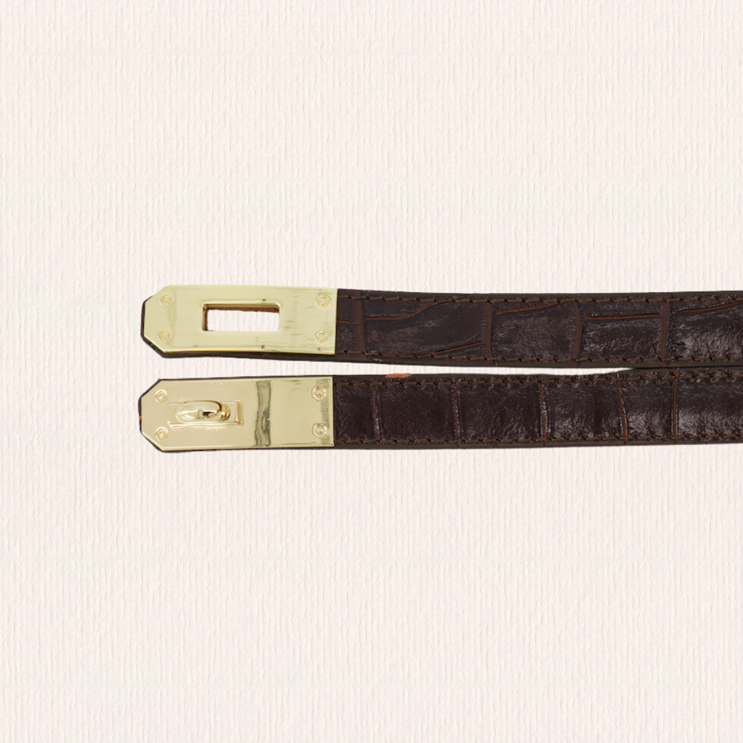 Deze leren wikkelriem is gemaakt van leer met een subtiele croco-print en is afgewerkt met een elegante goudkleurige draaisluiting. Dankzij het verstelbare schuifsysteem kan de riem op elke gewenste maat gedragen worden, waardoor hij zowel comfortabel als veelzijdig is in gebruik.
