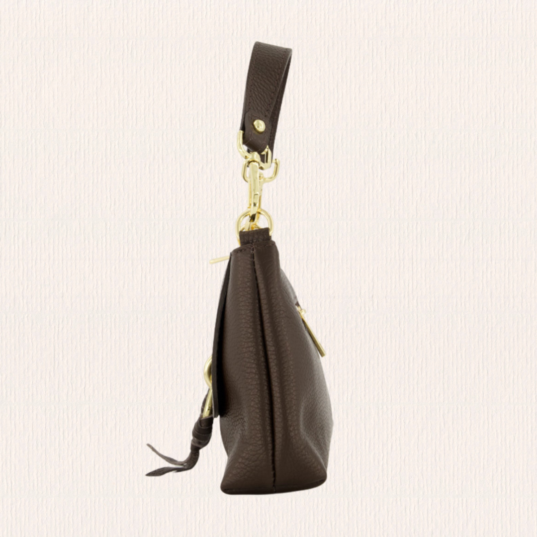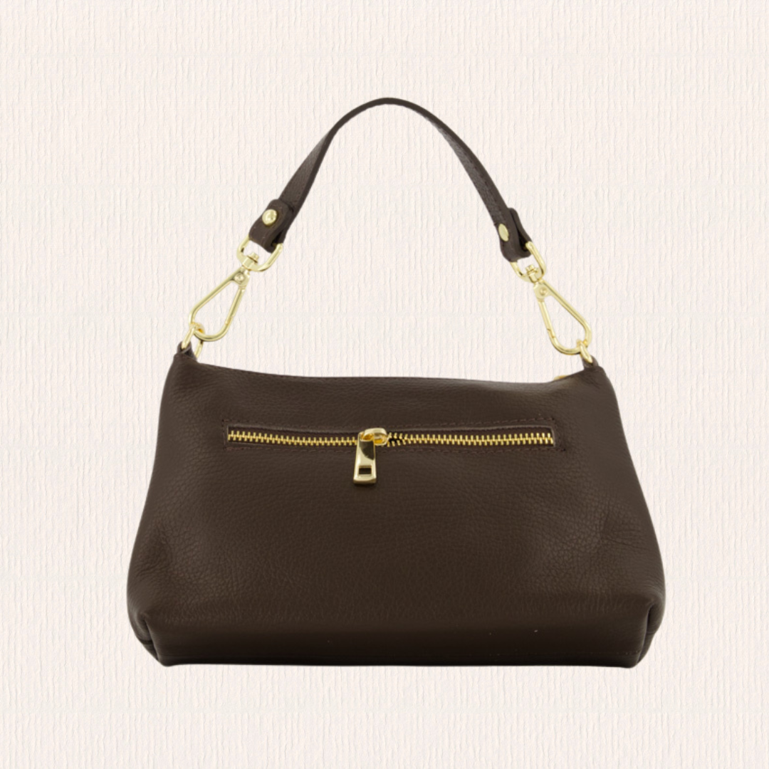 Deze leren handtas kan dankzij het afneembare en verstelbare hengsel ook comfortabel als crossbody gedragen worden. De tas is afgewerkt met glanzende hardware en heeft een hoofdvak met aan de binnenzijde een handig ritsvakje. De ritssluiting zorgt voor een veilige afsluiting.