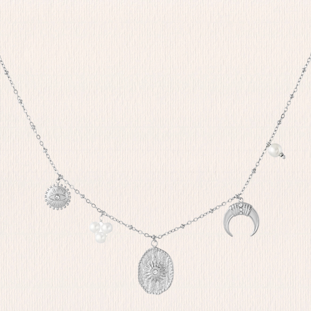 Elegante lange ketting met een charmant bloembedel, gemaakt van roestvrij staal (stainless steel).