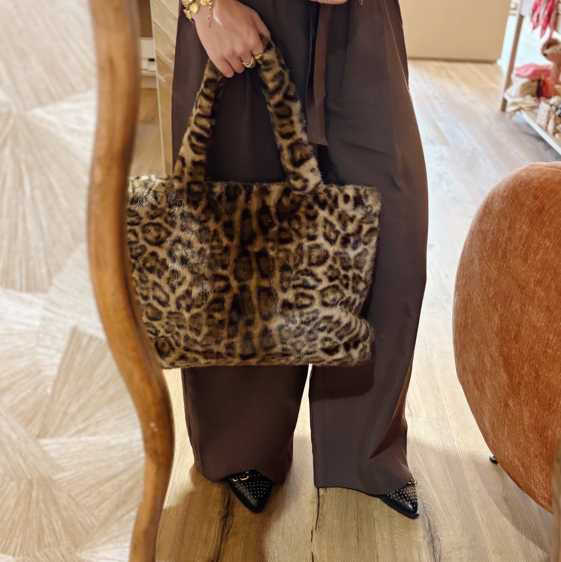 Knusse handtas in zachte panterprint, perfect voor al je essentials. De tas sluit veilig met een rits.