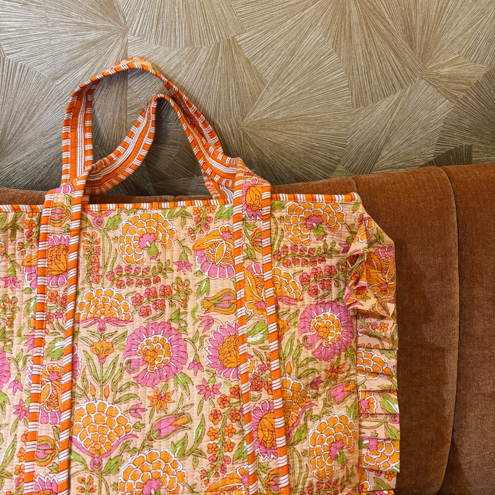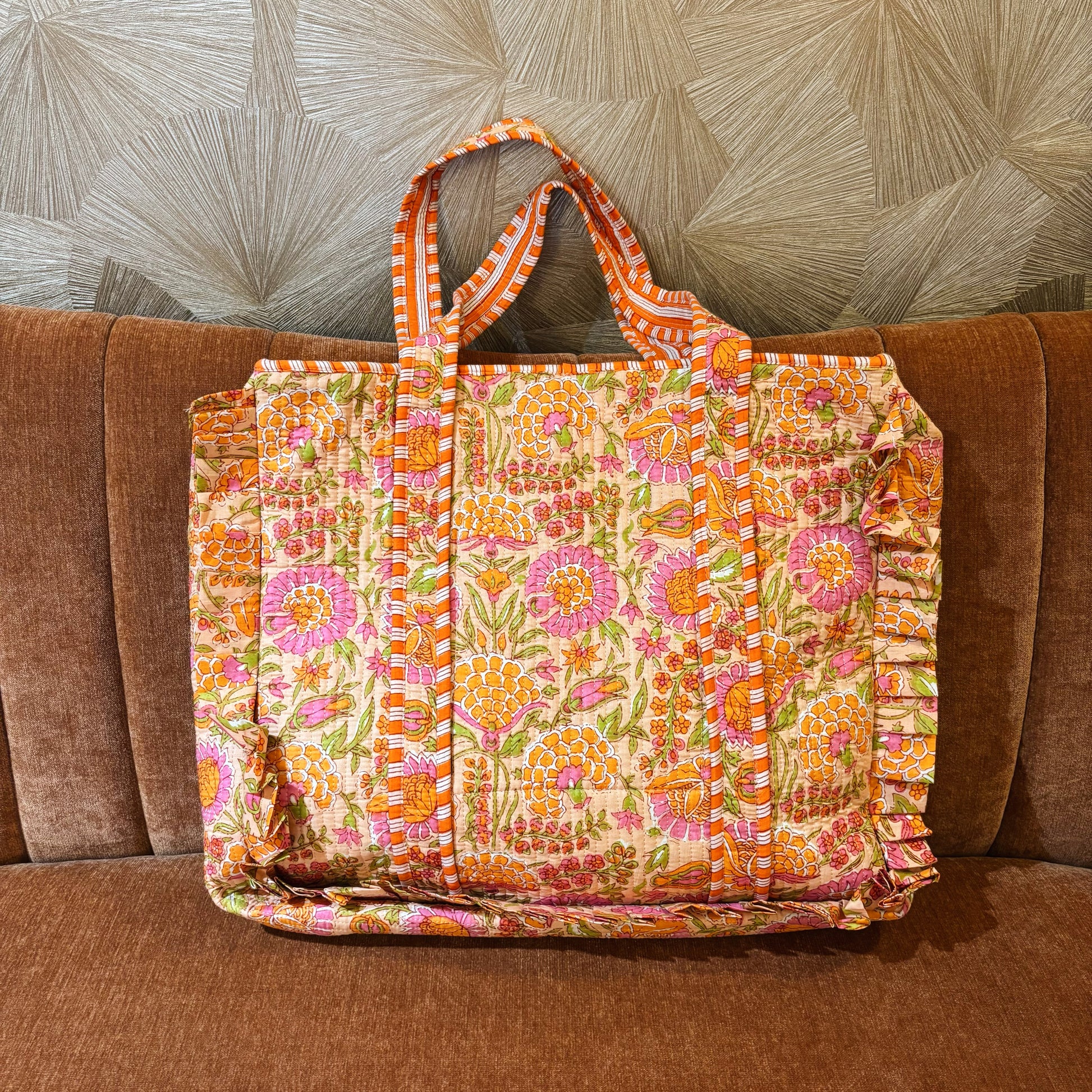 Ruime strandtas/weekendtas met vrolijke bloemenprint. De tas heeft een groot hoofdvak met een klein binnenzakje voor je essentials en een buitenzakje met ritssluiting.