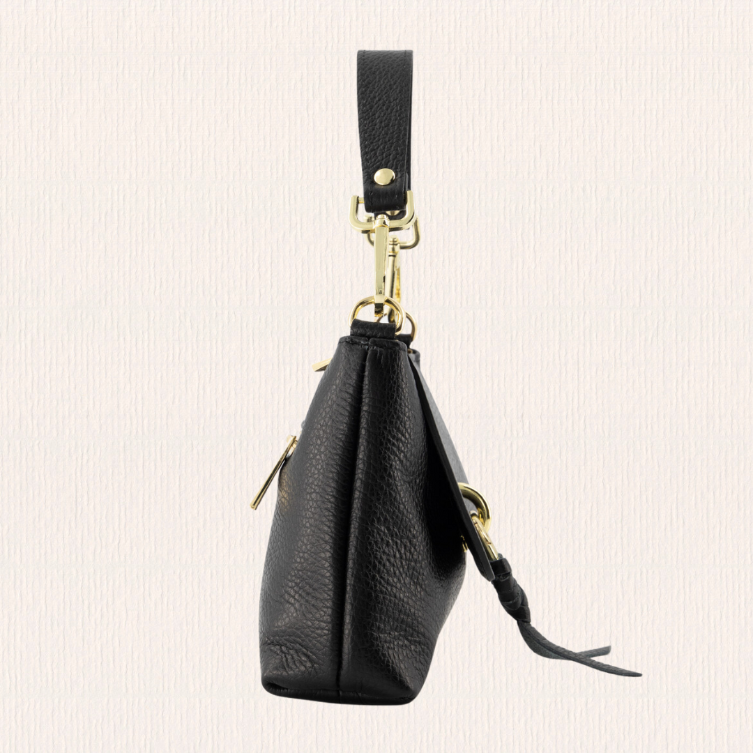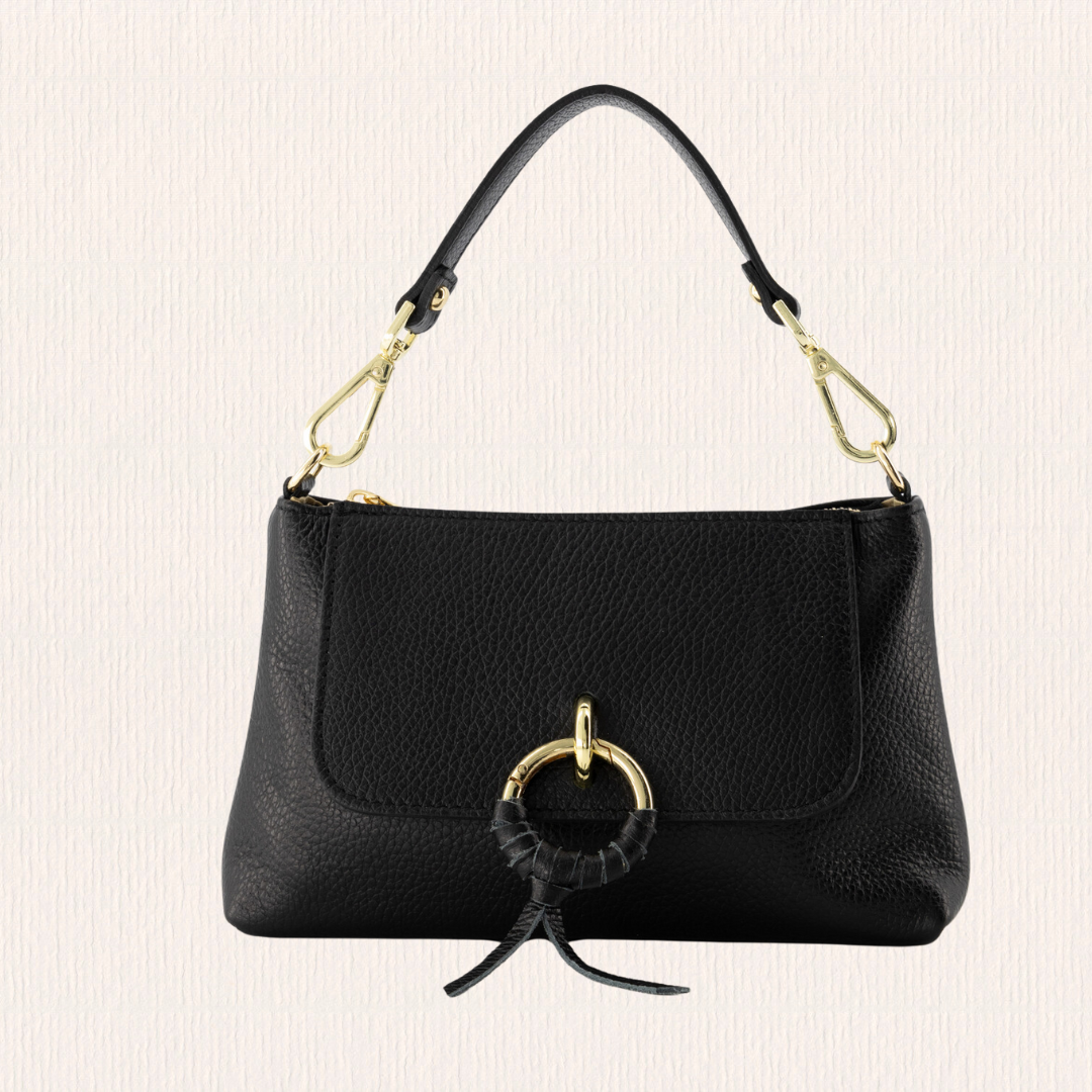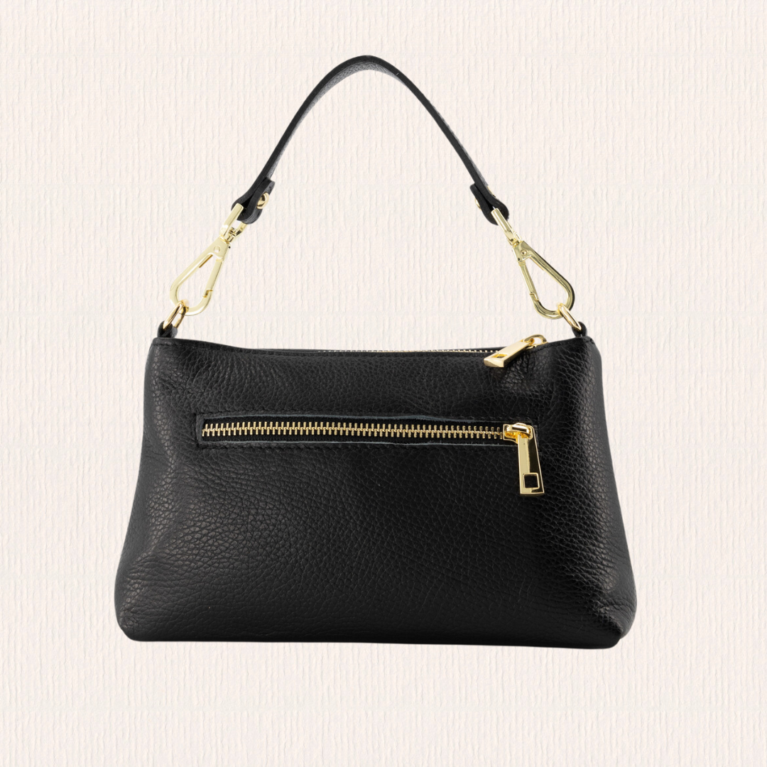 Deze leren handtas kan dankzij het afneembare en verstelbare hengsel ook comfortabel als crossbody gedragen worden. De tas is afgewerkt met glanzende hardware en heeft een hoofdvak met aan de binnenzijde een handig ritsvakje. De ritssluiting zorgt voor een veilige afsluiting.