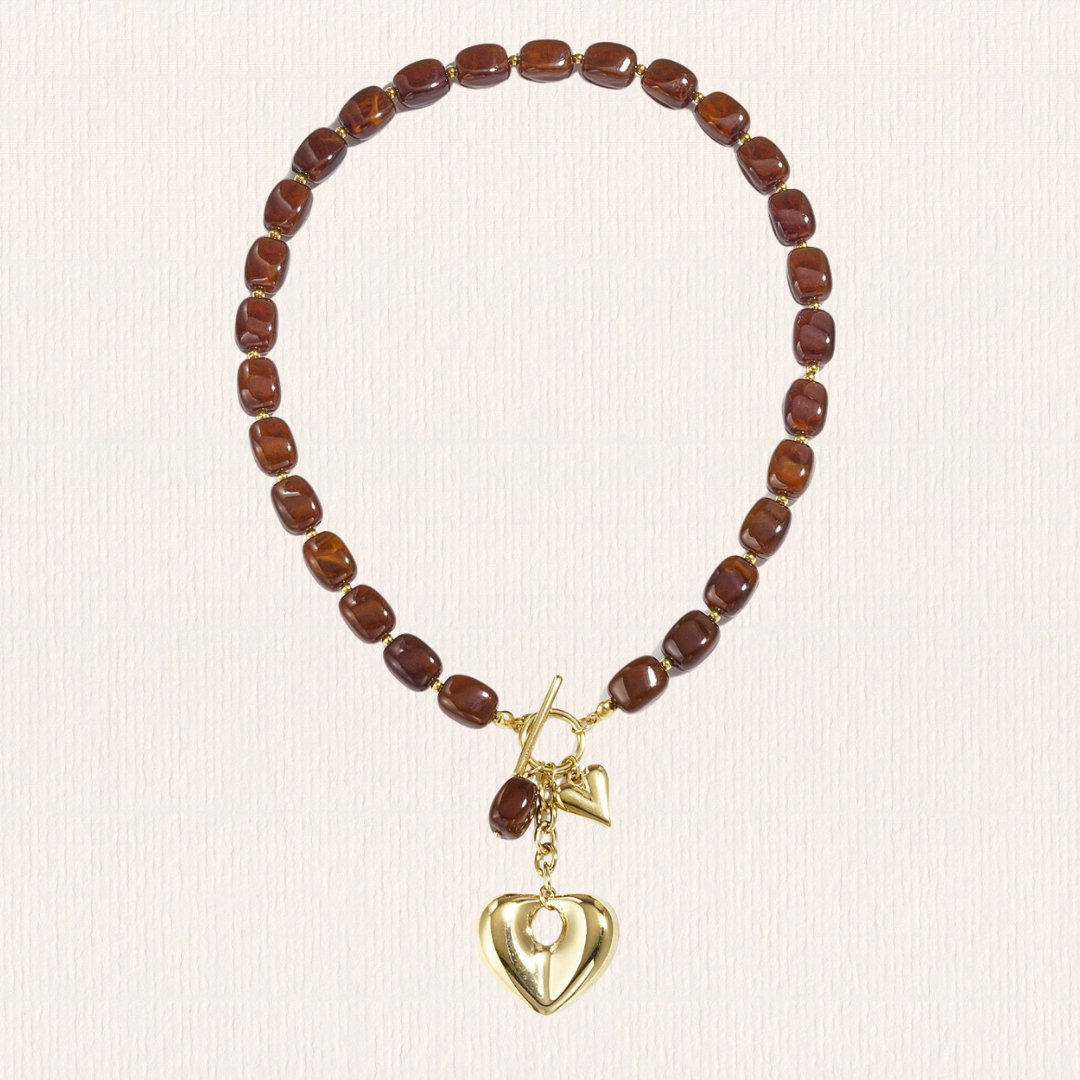 Bruine kralenketting met hartjesbedel
