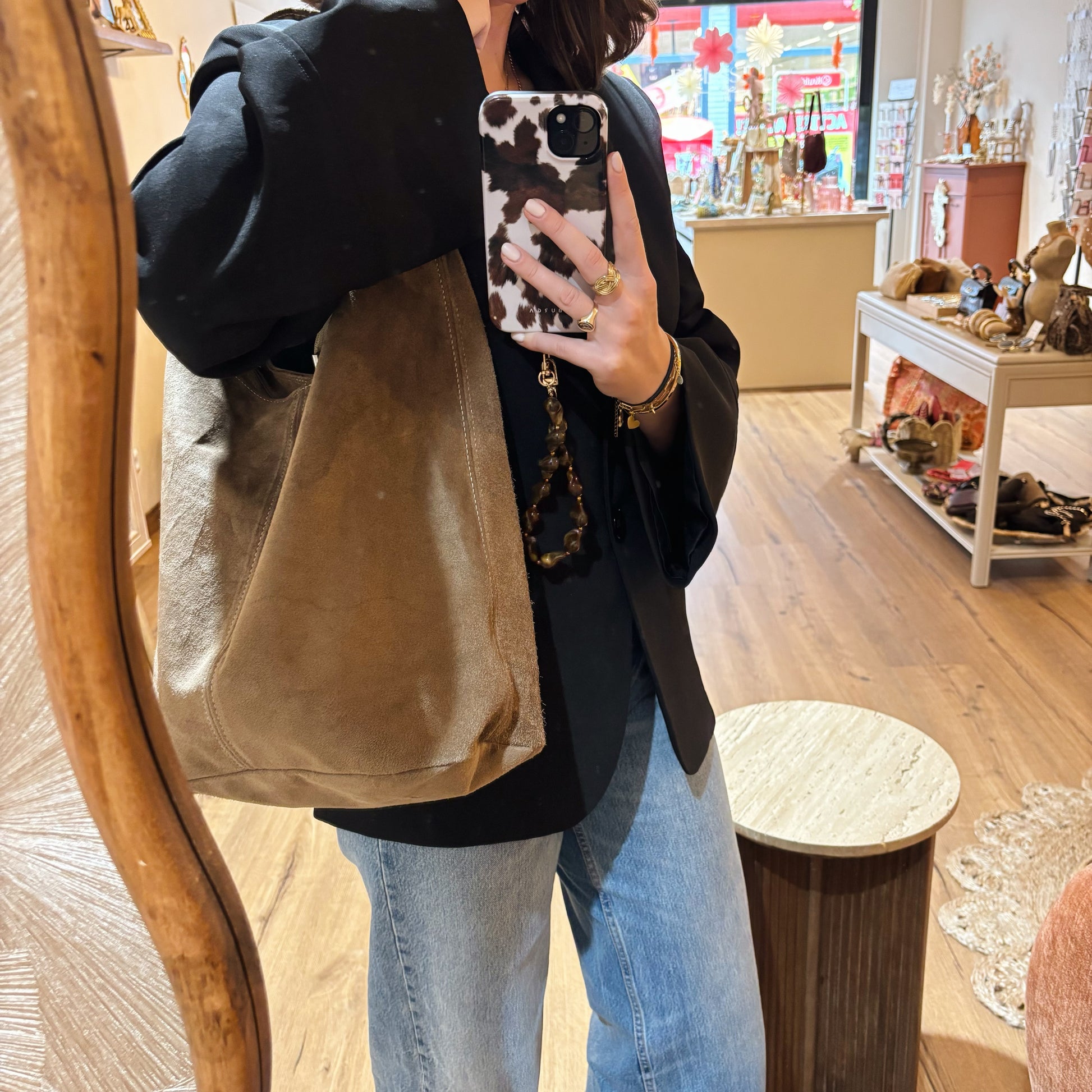 Deze stijlvolle schoudertas is vervaardigd van hoogwaardig suède leer. De tas beschikt over een ruim hoofdvak dat veilig kan worden afgesloten met een ritssluiting.
