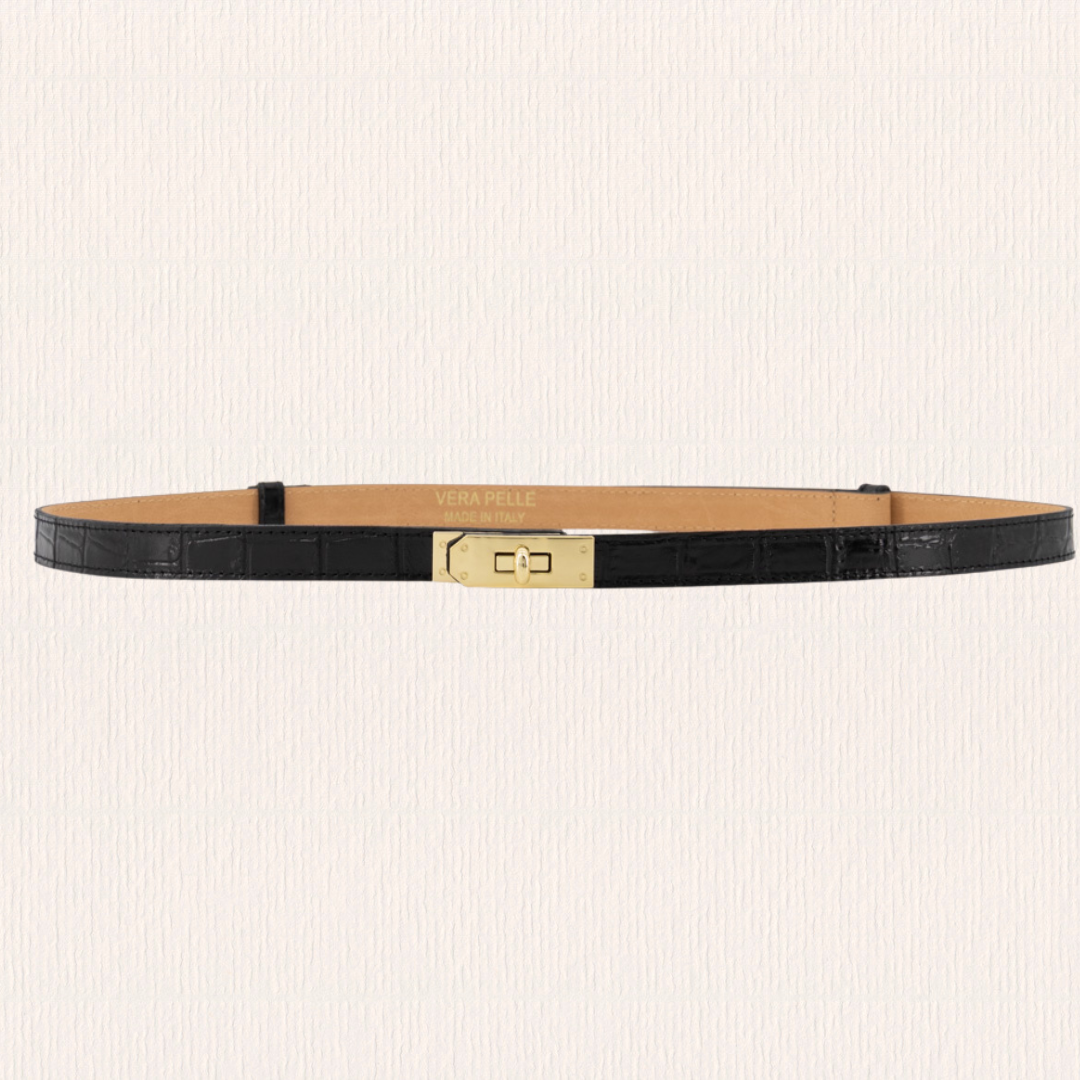 Deze leren wikkelriem is gemaakt van leer met een subtiele croco-print en is afgewerkt met een elegante goudkleurige draaisluiting. Dankzij het verstelbare schuifsysteem kan de riem op elke gewenste maat gedragen worden, waardoor hij zowel comfortabel als veelzijdig is in gebruik.