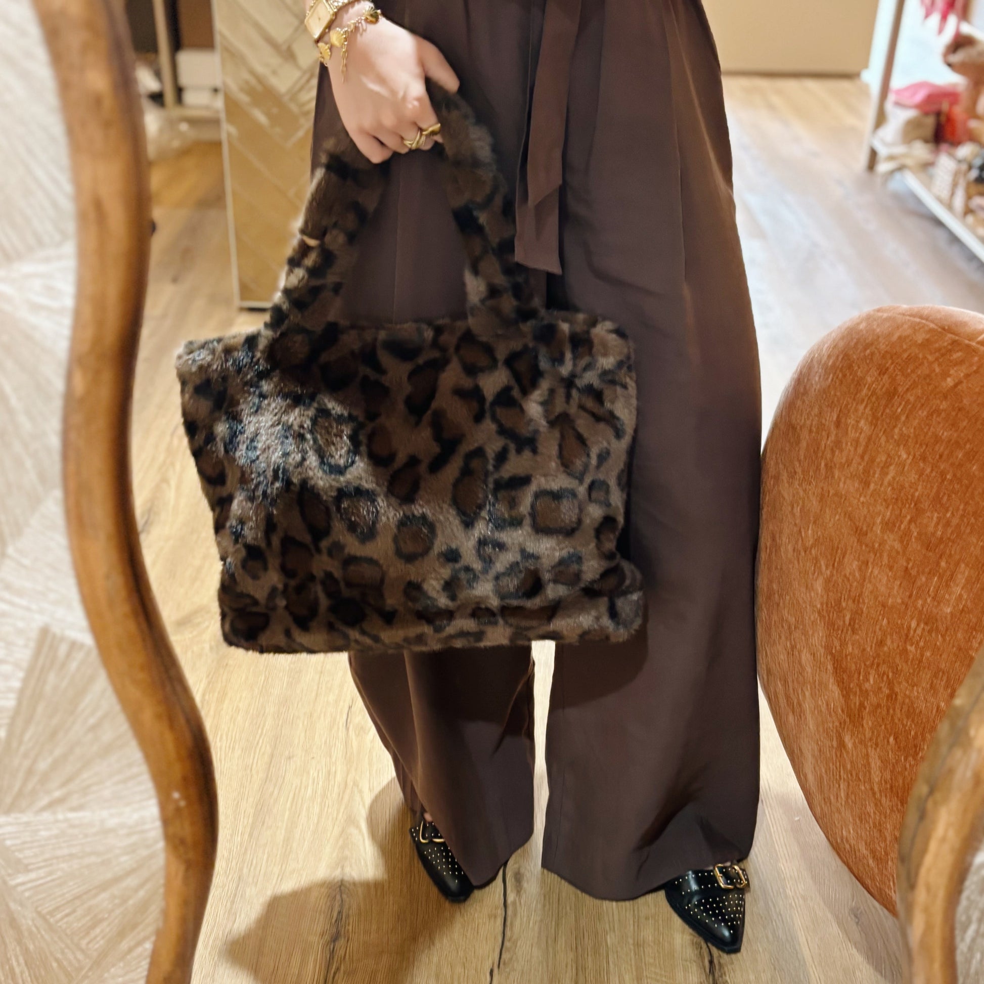 Knusse handtas in zachte panterprint, perfect voor al je essentials. De tas sluit veilig met een rits.